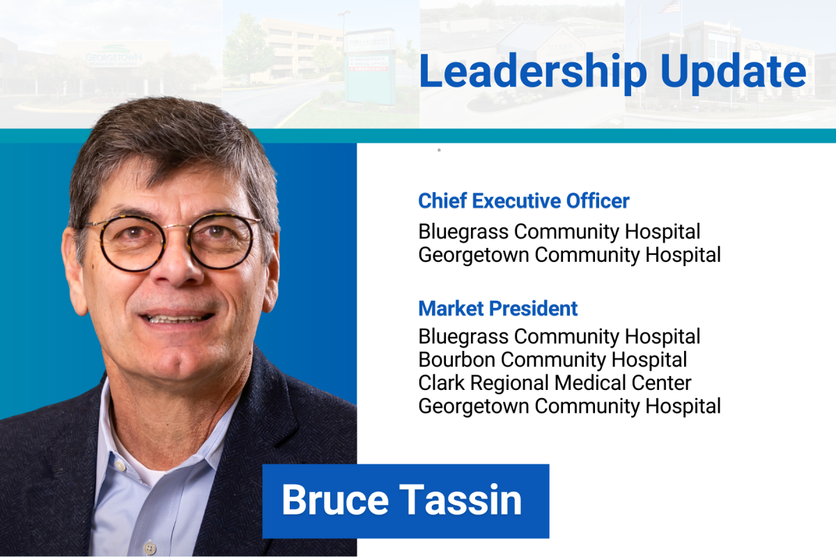 Georgetown, Kentucky – (December 9, 2025) Lifepoint Health’s Central Kentucky facilities today announced that Bruce Tassin has been named chief executive officer (CEO) of Georgetown Community Hospital and Bluegrass Community Hospital and market president of Clark Regional Medical Center and Bourbon Community Hospital in addition to Georgetown and Bluegrass, effective January 1, 2026. As market president, he will provide regional oversight of all four Central Kentucky hospitals.